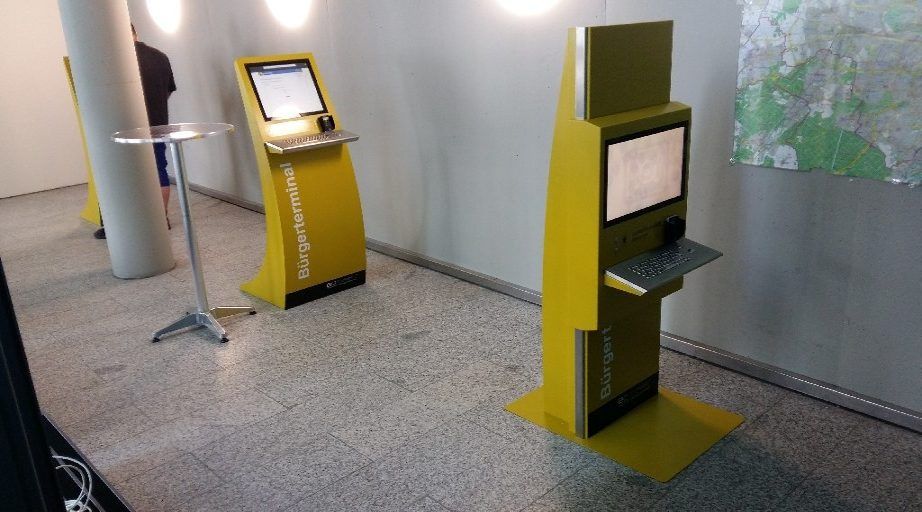 Dort stehen sie in öffentlichen Bereichen wie Foyers oder Eingangsbereichen und dienen Besuchern als Selfservice-System für verschiedenste online Funktionen der öffentlichen Verwaltung.